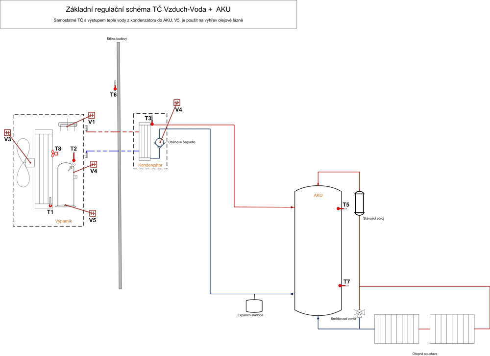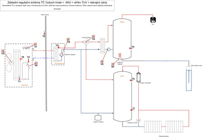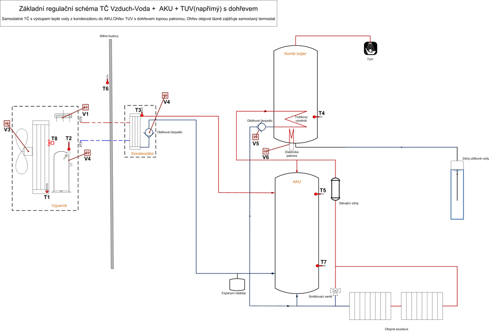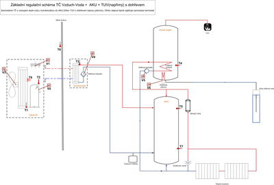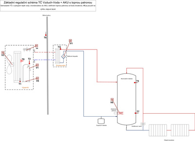 Regulační hydraulické schéma zajišťující otop a ohřev teplé užitkové vody. Pro tento případ je nejprve nahřívána TUV na požadovanou teplotu a poté systém přepnut na otop. V letním období je ohřev AKU blokován a realizuje se ohřev jen TUV. Nádrž na TUV má vždy záložní topnou patronu. Topná patrona je využita pro občasné hygienické přehřátí „Legionelní funkce“. Otopná soustava se předpokládá se stávajícím zdrojem tepla, kde výstup teplé vody z akumulační nádoby bude zpátečkou pro stávající zdroj a tento zajistí pouze dohřev na požadovanou teplotu. Regulační schéma především pro otopné systémy s vyšší teplotou topné vody anebo s vyšší teplotou bivalence – nezateplený dům.