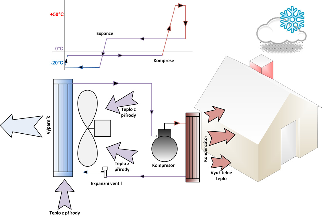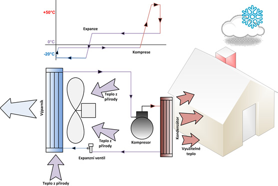 Tepelné čerpadlo není žádné perpetum mobile, anebo jiný záhadný stroj ale zařízení striktně dodržující veškeré fyzikální zákony Jeho princip činnosti je blízce podobný principu běžné domácí chladničky. Jeho činnost spočívá v tom, že speciální teplonosné medium, které obíhá tepelným čerpadlem pod vysokým tlakem odebírá obnovitelné teplo z přírody – ze vzduchu, z povrchové vody anebo ze zemně a předává jej do Vašeho domova. Určitě se zdá divné, jak je možné odebírat teplo ze vzduchu když je venku hluboko pod nulou? Ale pro TČ je i mráz využitelné teplo.