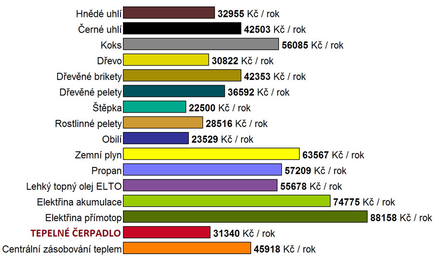 Motto: „Pokud by vývoj energií rostl v budoucnu podobným tempem jako dosud, bude úspora energií jednoznačně nejlepší možnou investicí pro každého z nás“Porovnání nákladů na vytápění podle druhu paliv pro: