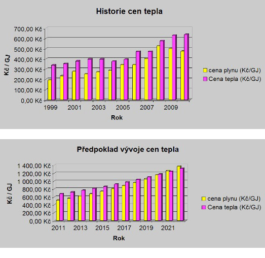 Vše výše uvedené platí pro ceny energií v roce 2009. Při současném vývoji cen energii s meziročním nárůstem 7% se v budoucnosti situace jednoznačně nakloní na stranu topení tepelnými čerpadly. Pro ilustraci je vidět historie vývoje cen tepla a prognóza dalšího vývoje do roku 2021.
