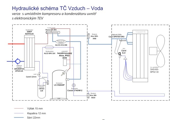 Další prvky TČ mají funkci především kontrolní a ochranou. Pro ilustraci je vidět obrázek s umístěním a zapojením dílů TČ Vzduch-Voda.